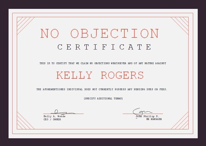 It is a legal document which is issued by any agency, organization or company in certain cases where authority issuing this no objection certificate to the covenant of the certificate. Perhaps in the matters of exports this certificate will generate to forcefully express that someone has legal ascensions to acts under the specified limits and enjoy the rights mention on it. This certification is a requirement at most of the government-based departments predominantly. This is mostly used for the employment related concerns. This certificate is also presented to the employee when he/she resigned from his/her firm and wants to start his/her new job. This certificate defines the performance and abilities of employee that used by previous firm. In addition, for reference purposes; one can use No Objection Certificate. It will be a best tool for you if you are designing No Objection Certificate for yourself.